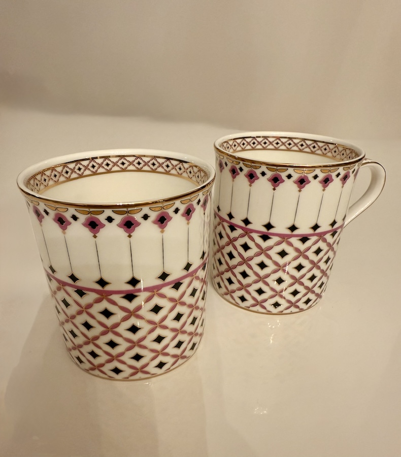 Jaal Royale Rose verbindet die Eleganz traditioneller indischer Gittermuster mit moderner Klarheit. Jede Tasse zeigt ein feines, rhythmisches Ornament, das von zarten Goldakzenten eingerahmt wird – eine stilvolle Verbindung aus indischem Kulturerbe und zeitgemäßem Design. Die Farbvarianten setzen jeweils ihre eigene Atmosphäre, von warm-rosé bis frisch-türkis, und lassen sich mühelos miteinander kombinieren.