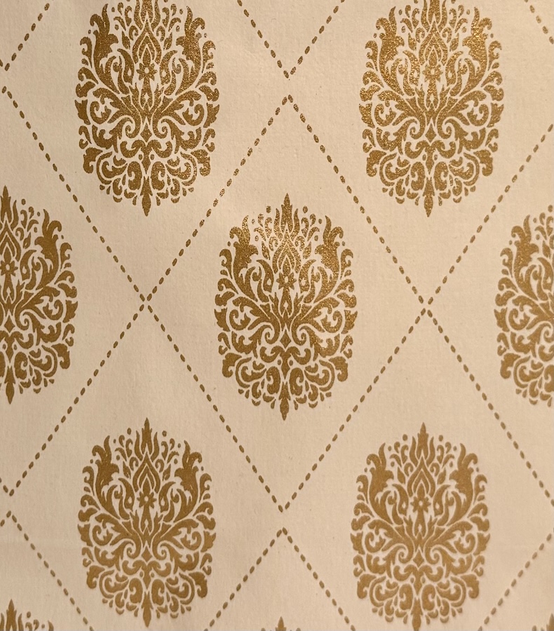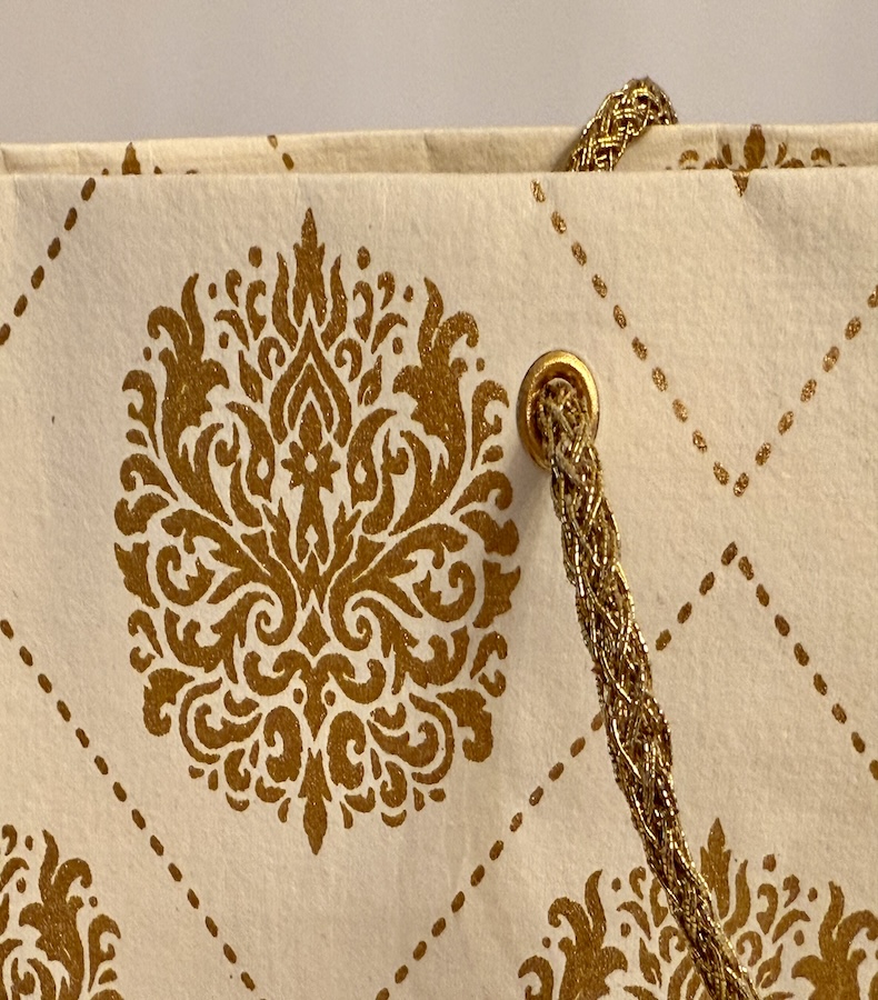 Die handgefertigte Papiertasche Golden Harmony besticht durch ihr harmonisches Muster aus goldenen Ornamenten auf cremefarbenem Grund. Aus recycelter Baumwolle gefertigt und in Jaipur veredelt, steht sie für Achtsamkeit und Stilbewusstsein. Ideal für edle Geschenke, Hochzeiten oder festliche Anlässe.