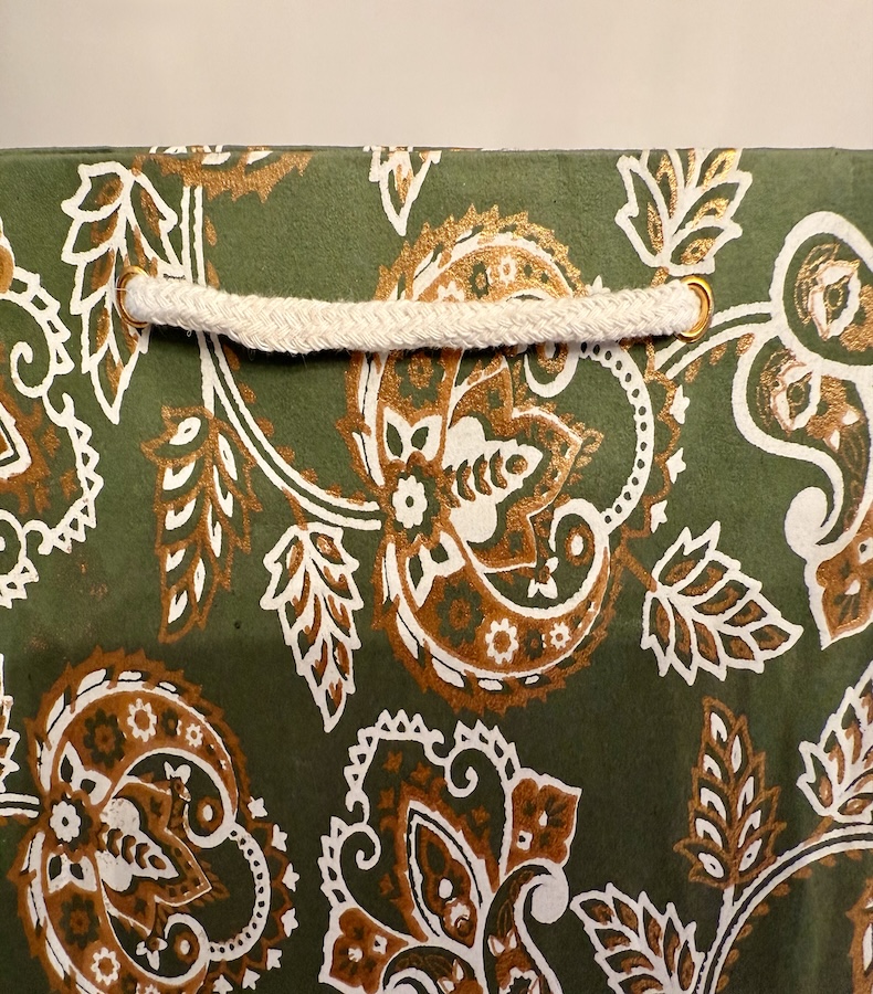 Diese luxuriöse Geschenktasche aus handgeschöpftem Baumwollpapier verbindet Einzigartigkeit und Stil. Das florale Muster in Gold und Weiß erinnert an traditionelle Blockdrucke aus Rajasthan und verleiht jedem Geschenk einen Hauch von zeitloser Schönheit. Ein nachhaltiger Begleiter für besondere Momente.