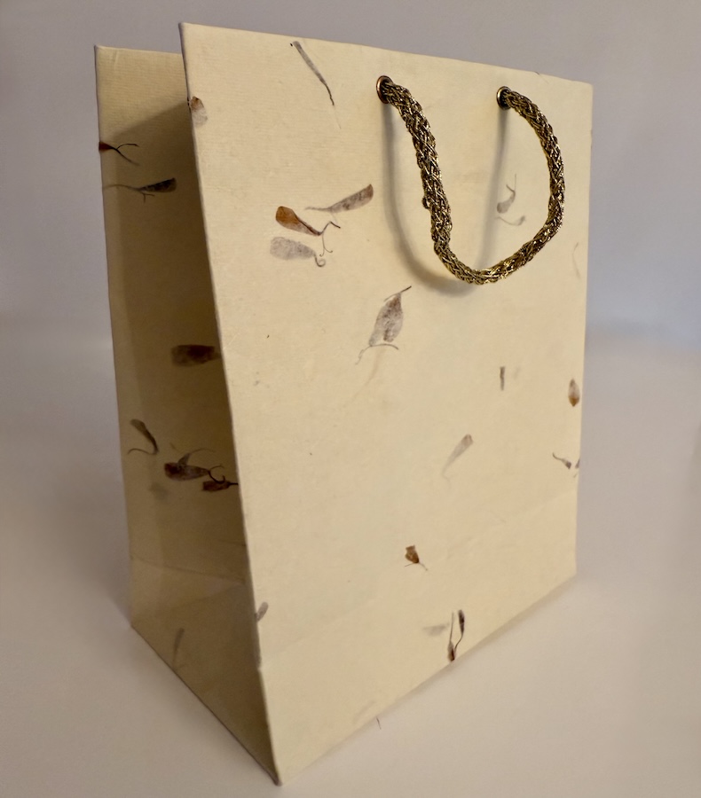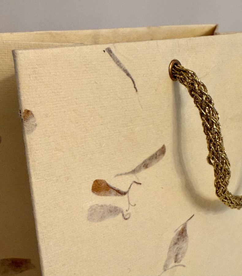 Die Geschenktasche Whispering Leaves wurde aus handgeschöpftem Baumwollpapier gefertigt, in das zarte Blätter eingearbeitet sind. Jedes Stück erzählt seine eigene Geschichte von Natur, Achtsamkeit und purer Schönheit. Ideal für bewusste Schenkende, die Nachhaltigkeit und Stil vereinen möchten.