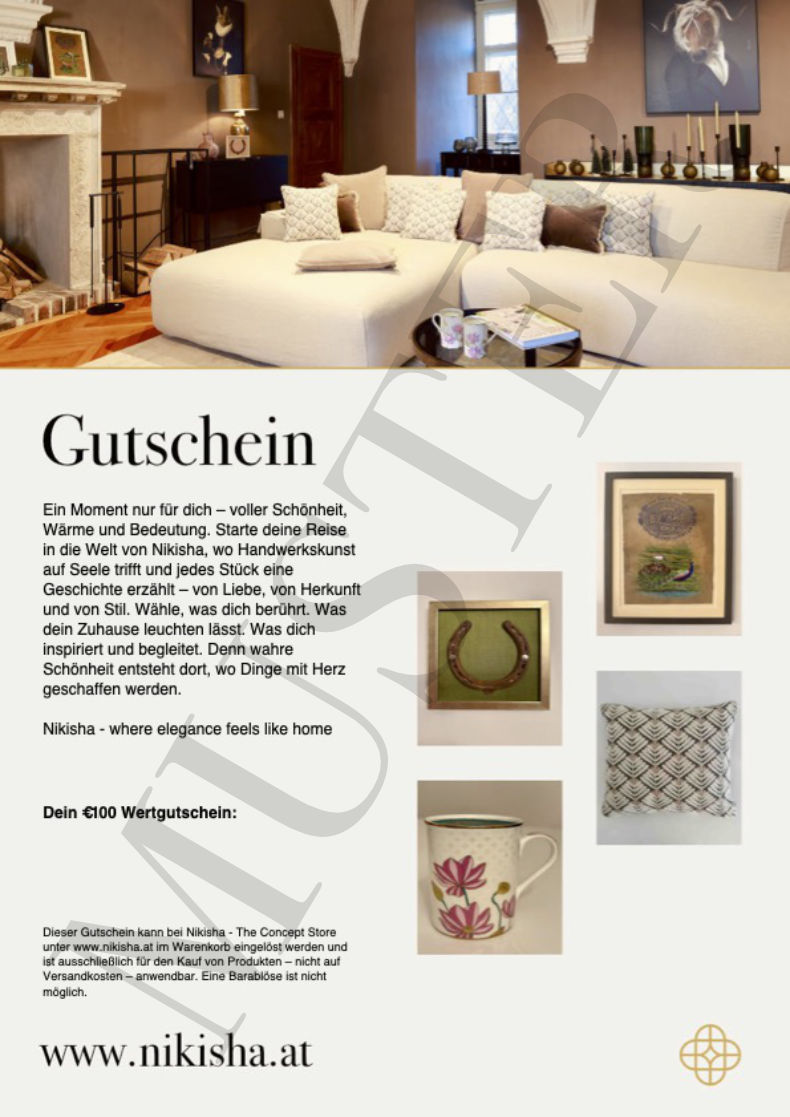 - Hinweis: Nach deinem Kauf erhältst du den persönlichen Gutscheincode bequem per E-Mail. Du kannst den Gutschein direkt ausdrucken und verschenken – und der Beschenkte kann ihn ganz einfach bei Nikisha – The Concept Store einlösen. Bitte beachte, dass eine Barauszahlung nicht möglich ist.