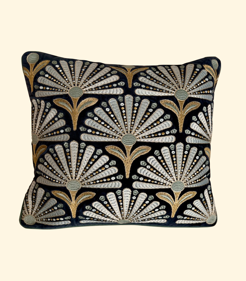 Der Kissenbezug Golden Mirage bringt indische Handwerkskunst in ihrer schönsten Form in dein Zuhause. Das edle, fächerförmige Muster wurde mit feiner Stickerei in goldenen und elfenbeinfarbenen Nuancen auf dunkelblauem Stoff gearbeitet und erinnert an die Eleganz klassischer Art-Déco-Designs.
