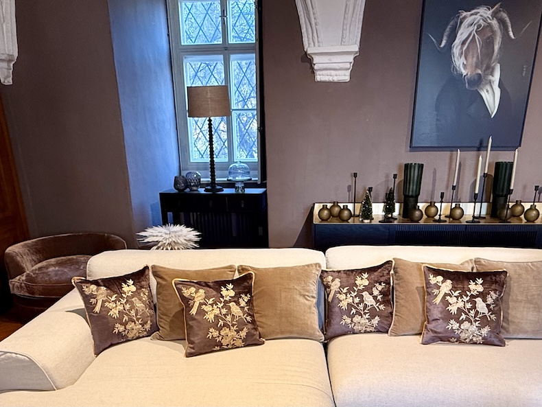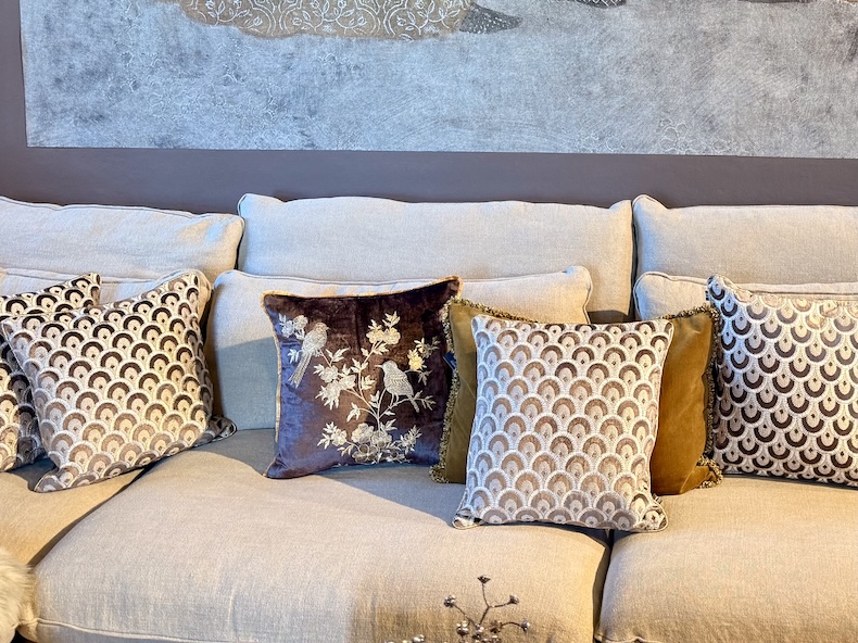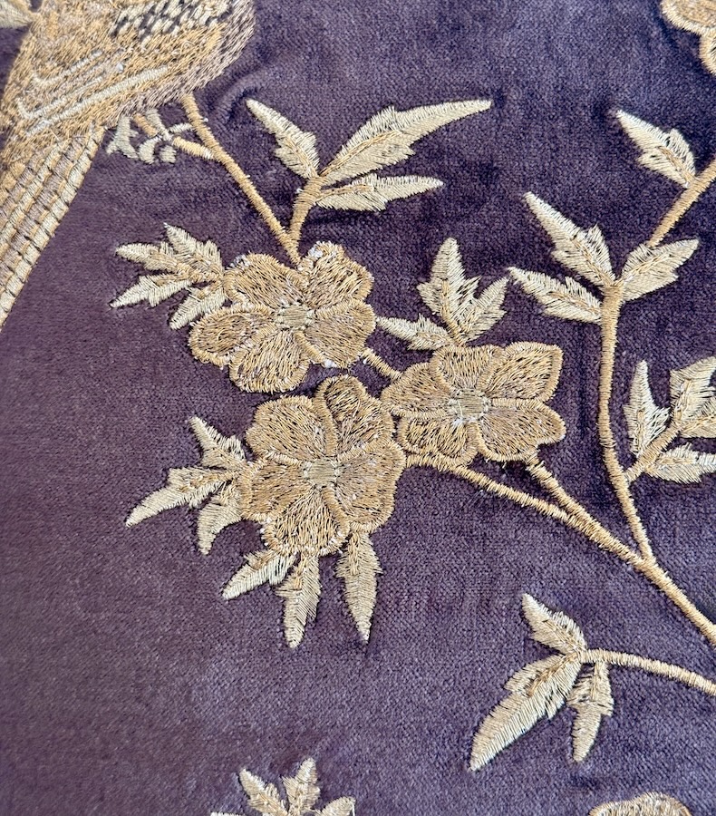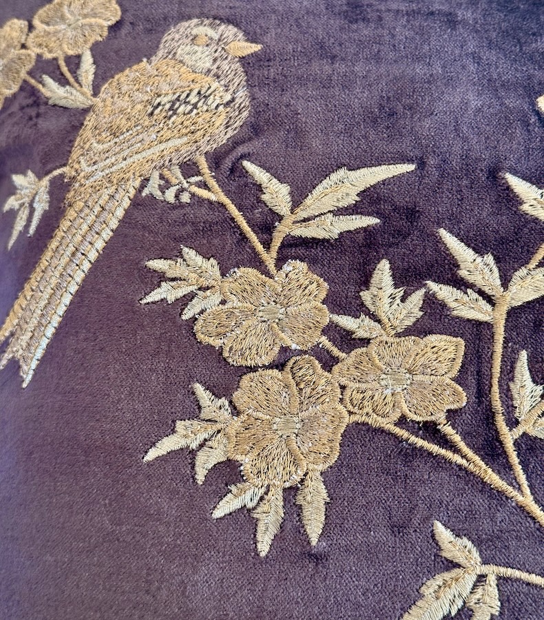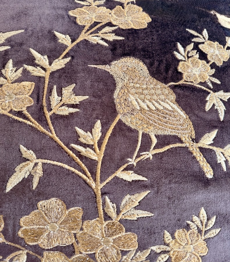 Der Kissenbezug Golden Sparrows verkörpert pure Eleganz. Auf dunkelbraunem, edel schimmerndem Samt sitzen goldene Spatzen auf einem zarten Blumenzweig – ein Motiv, das Anmut, Leichtigkeit und Harmonie ausstrahlt. Jede Stickerei wird mit größter Sorgfalt in traditionell gefertigt und macht jedes Stück zu einem kleinen Kunstwerk.