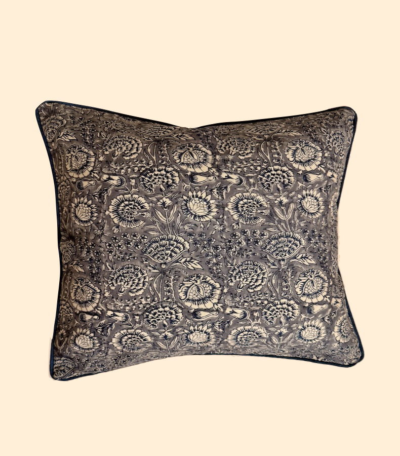 Ein sanftes Meer aus kühlen, blau-weißen Blüten – elegant, frisch und zeitlos. Unser bezaubernder Kissenbezug Indigo Whisper Blue bringt subtile Leichtigkeit in dein Zuhause. Eine Hommage an die ruhige Poesie indischer Gärten – zeitlose Blumenmotive, zarte Linien und pudrige Indigotöne, die jedem Raum eine ruhige, luxuriöse Note schenken. Jeder Kissenbezug ist wendbar und zeigt auf der Rückseite ein harmonisch abgestimmtes Muster – zwei Designs, ein Kissen, mehrerer Gestaltungsmöglichkeiten, insbesondere in Kombination mit Indigo Whisper Blue und Azure Bloom Teal.