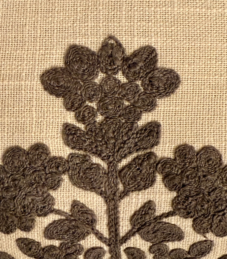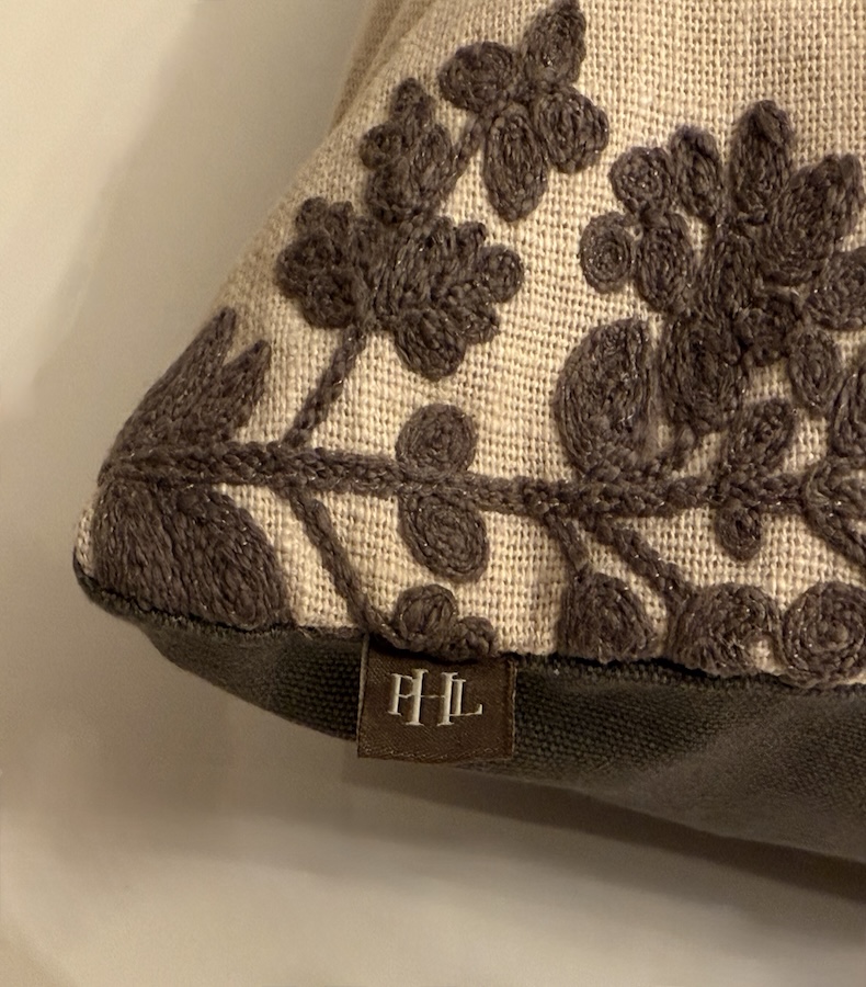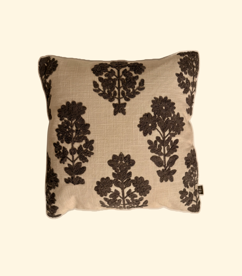 Der Kissenbezug Ivory Garden vereint klassische Eleganz mit kunstvollem Handwerk. Das feine florale Muster in dunkelgrauer Stickereien hebt sich sanft vom cremefarbenen Grundstoff ab und verleiht jedem Wohnraum eine Aura von Ruhe und Stilbewusstsein.