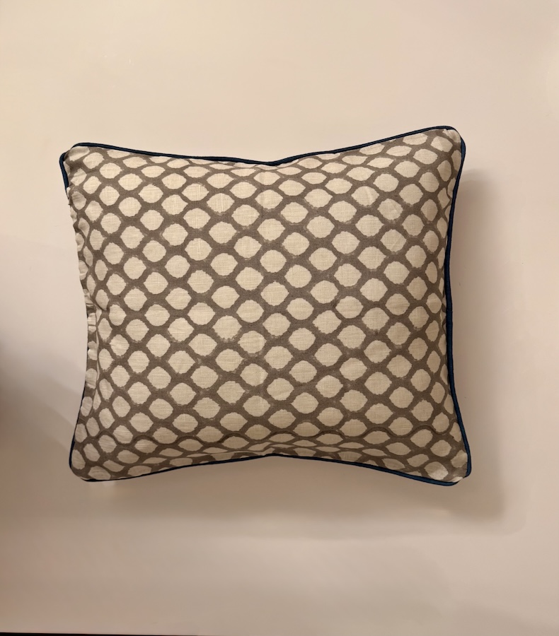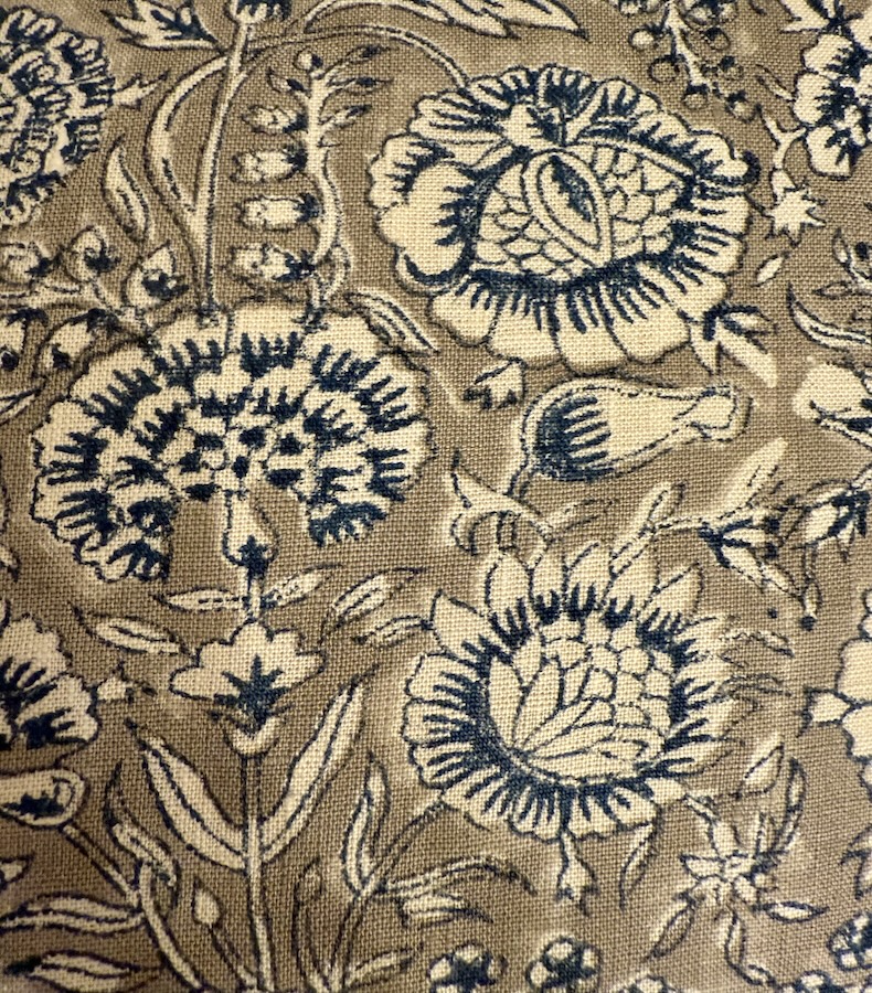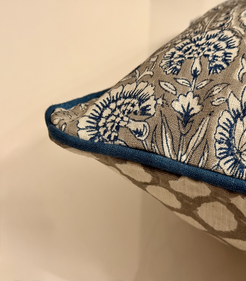 Ein edles Spiel aus taupefarbenem Grundton und feinen, indigo-weißen Blütenranken. Unser wundervoller Kissenbezug Midnight Blossom Taupe verbindet Tradition mit moderner Ruhe und bringt eine dezente, elegante Wärme in jedes Ambiente. Eine Hommage an die ruhige Poesie indischer Gärten – zeitlose Blumenmotive, zarte Linien und pudrige Indigotöne, die jedem Raum eine ruhige, luxuriöse Note schenken. Jeder Kissenbezug ist wendbar und zeigt auf der Rückseite ein harmonisch abgestimmtes Muster – zwei Designs, ein Kissen, mehrerer Gestaltungsmöglichkeiten, insbesondere in Kombination mit Indigo Whisper Blue und Azure Bloom Teal.