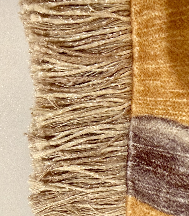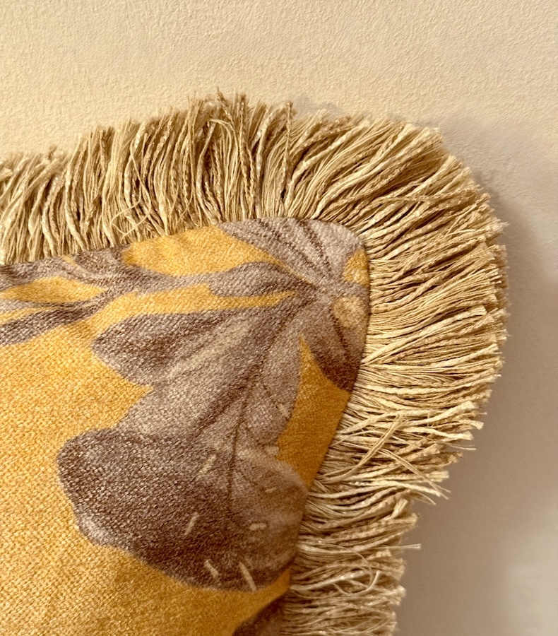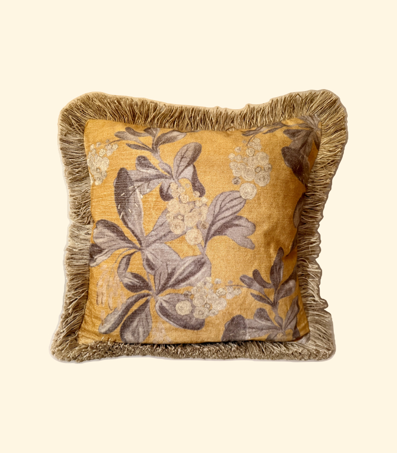 Unser sanfter Kissenbezug Sunlit Bloom in warmen Gelb- und Naturtönen mit floralem Muster und feinen Fransen erstrahlt in einer ruhigen, einladenden Wärme.