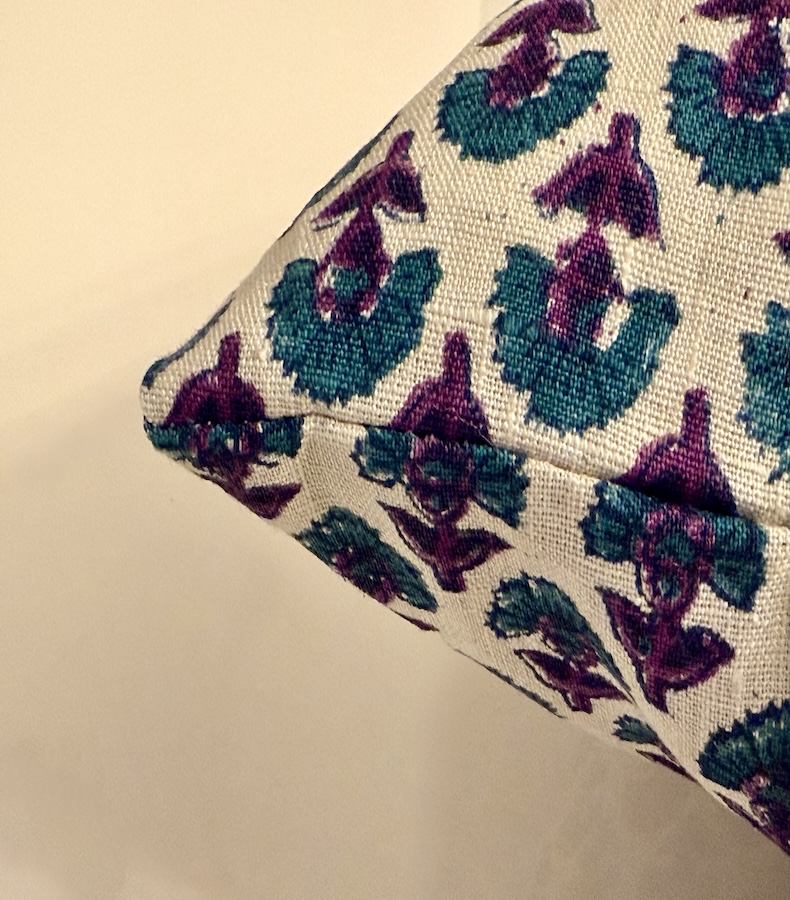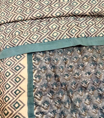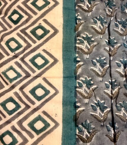 Teal Whisper Blossom ist eine Hommage an die poetische Schönheit kleiner floraler Details. Das filigrane Blütenmuster in Teal und Violett erinnert an die ruhigen Gärten Rajasthans, während die weiche Farbpalette gleichzeitig modern und zeitlos wirkt.