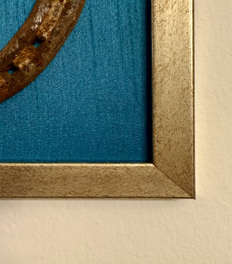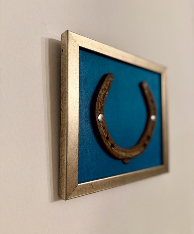 Das Kunstwerk „Golden Fortune“ steht für Glück, Schutz und gelebte Geschichte. Jedes Hufeisen ist ein echtes Original – einst getragen von Reitpferden, die ihre eigenen Wege gegangen sind. Ihre Spuren erzählen von Bewegung, Stärke und Vertrauen – und machen jedes Stück zu einem Unikat mit Charakter. Auf tiefblauer, schimmernder Seide ruhend und von einem zart goldenen Rahmen eingefasst, entfaltet „Golden Fortune“ eine stille, kraftvolle Präsenz – ein Kunstwerk voller Seele, Symbolik und positiver Energie.