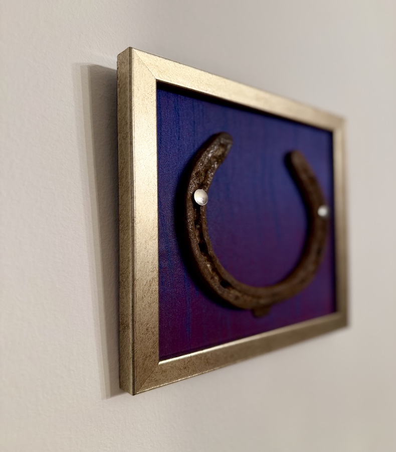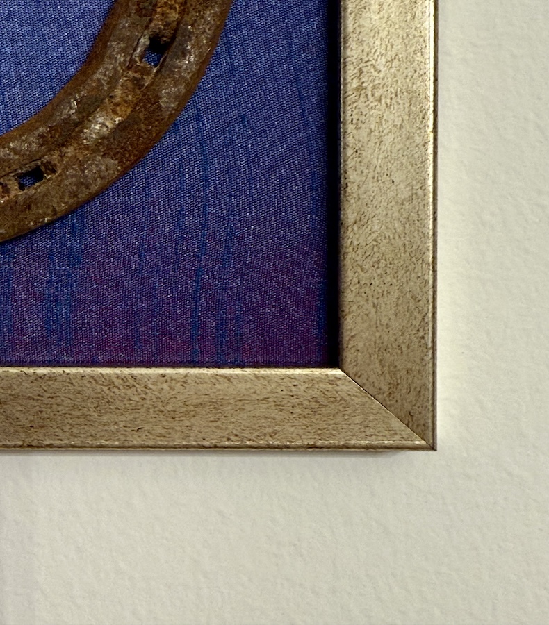 Das Kunstwerk „Golden Fortune“ steht für Glück, Schutz und gelebte Geschichte. Jedes Hufeisen ist ein echtes Original – einst getragen von Reitpferden, die ihre eigenen Wege gegangen sind. Ihre Spuren erzählen von Bewegung, Stärke und Vertrauen – und machen jedes Stück zu einem Unikat mit Charakter. Auf blauvioletter, schimmernder Seide ruhend und von einem zart goldenen Rahmen eingefasst, entfaltet „Golden Fortune“ eine stille, kraftvolle Präsenz – ein Kunstwerk voller Seele, Symbolik und positiver Energie.