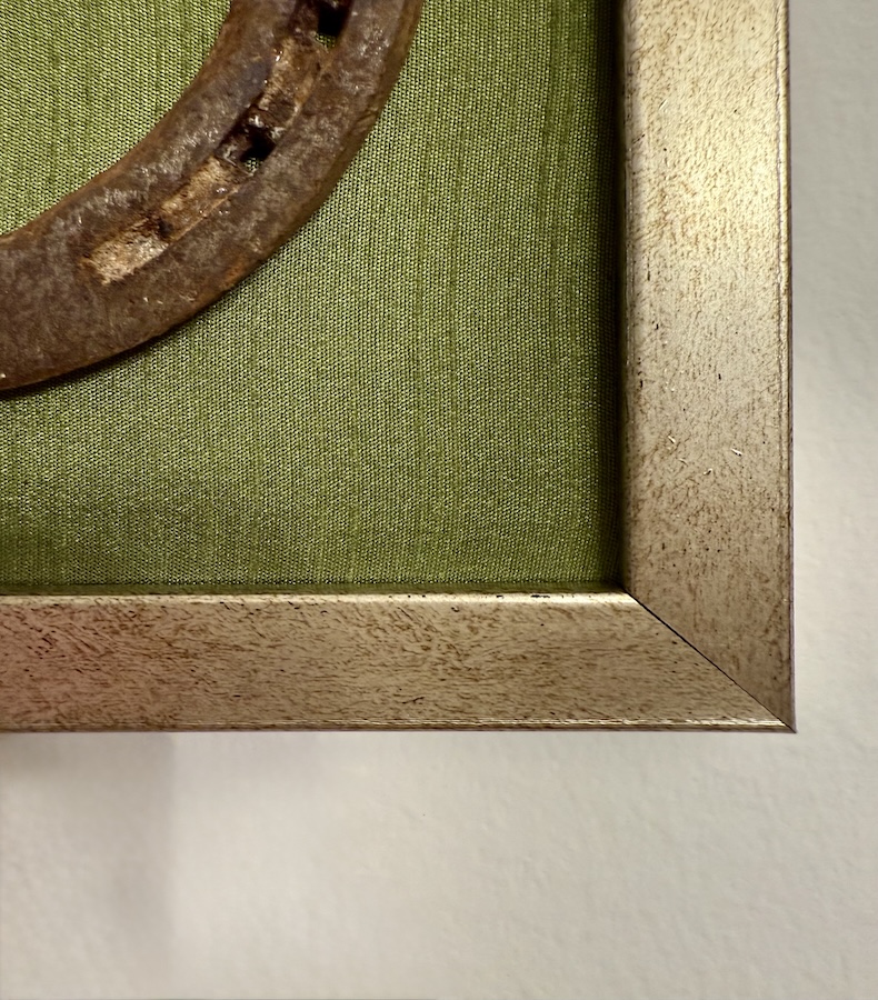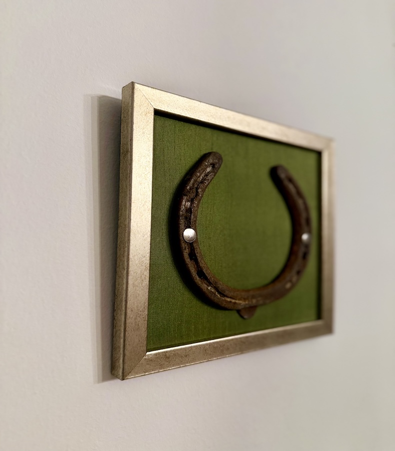 Das Kunstwerk „Golden Fortune“ steht für Glück, Schutz und gelebte Geschichte. Jedes Hufeisen ist ein echtes Original – einst getragen von Reitpferden, die ihre eigenen Wege gegangen sind. Ihre Spuren erzählen von Bewegung, Stärke und Vertrauen – und machen jedes Stück zu einem Unikat mit Charakter. Auf olivgrüner, schimmernder Seide ruhend und von einem zart goldenen Rahmen eingefasst, entfaltet „Golden Fortune“ eine stille, kraftvolle Präsenz – ein Kunstwerk voller Seele, Symbolik und positiver Energie.