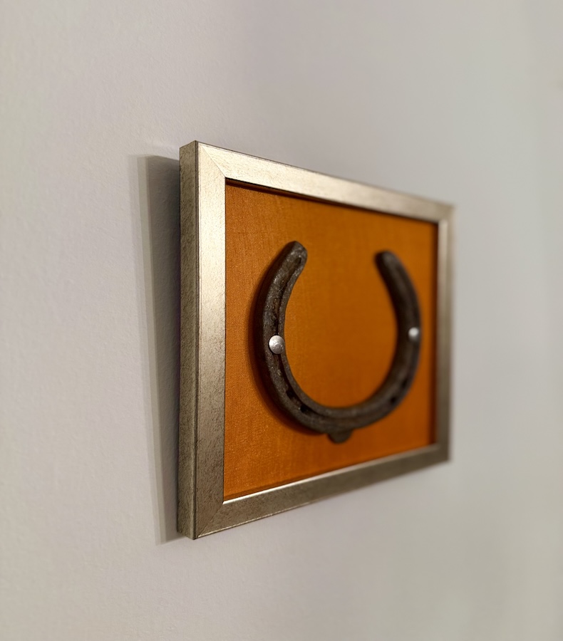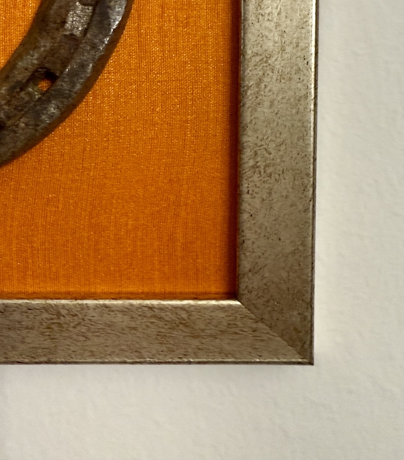 Das Kunstwerk „Golden Fortune“ steht für Glück, Schutz und gelebte Geschichte. Jedes Hufeisen ist ein echtes Original – einst getragen von Reitpferden, die ihre eigenen Wege gegangen sind. Ihre Spuren erzählen von Bewegung, Stärke und Vertrauen – und machen jedes Stück zu einem Unikat mit Charakter. Auf orangener, schimmernder Seide ruhend und von einem zart goldenen Rahmen eingefasst, entfaltet „Golden Fortune“ eine stille, kraftvolle Präsenz – ein Kunstwerk voller Seele, Symbolik und positiver Energie.