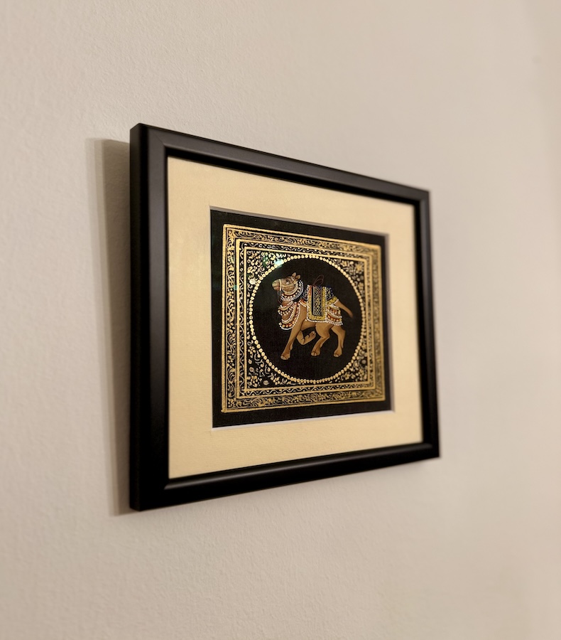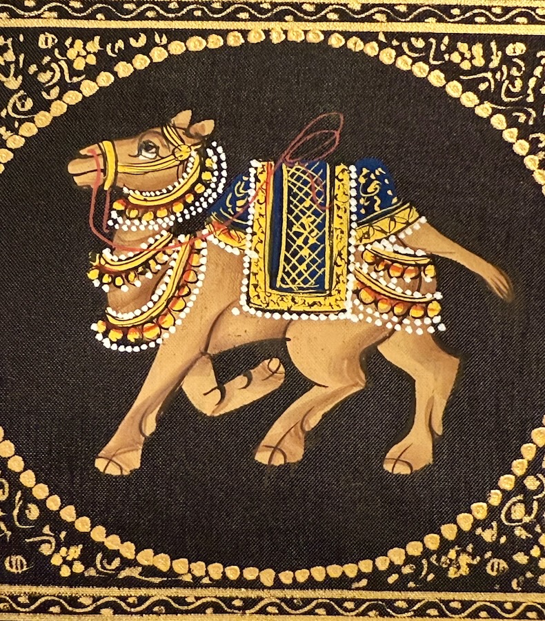 „Desert Grace“ ist eine Hommage an die stille Schönheit der Wüste und die reiche Kunsttradition Rajasthans. Das Werk zeigt ein kunstvoll geschmücktes Kamel – Symbol für Stärke, Ausdauer und Würde – meisterhaft auf zarte Seide gemalt. Mit präziser Hand und feinsten Pinseln wird jede Linie, jede goldene Kontur von erfahrenen Kunsthandwerkern in Rajasthan gestaltet.