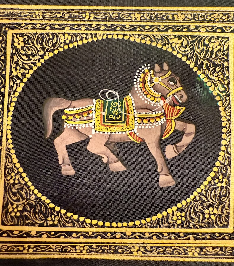 Das Kunstwerk „Royal Stride“ zeigt ein prachtvoll geschmücktes Pferd – Sinnbild königlicher Stärke, Stolz und Anmut. In feinster Rajasthani Miniaturmalerei auf Seide festgehalten, verbindet dieses Kunstwerk handwerkliche Perfektion mit stiller Eleganz.