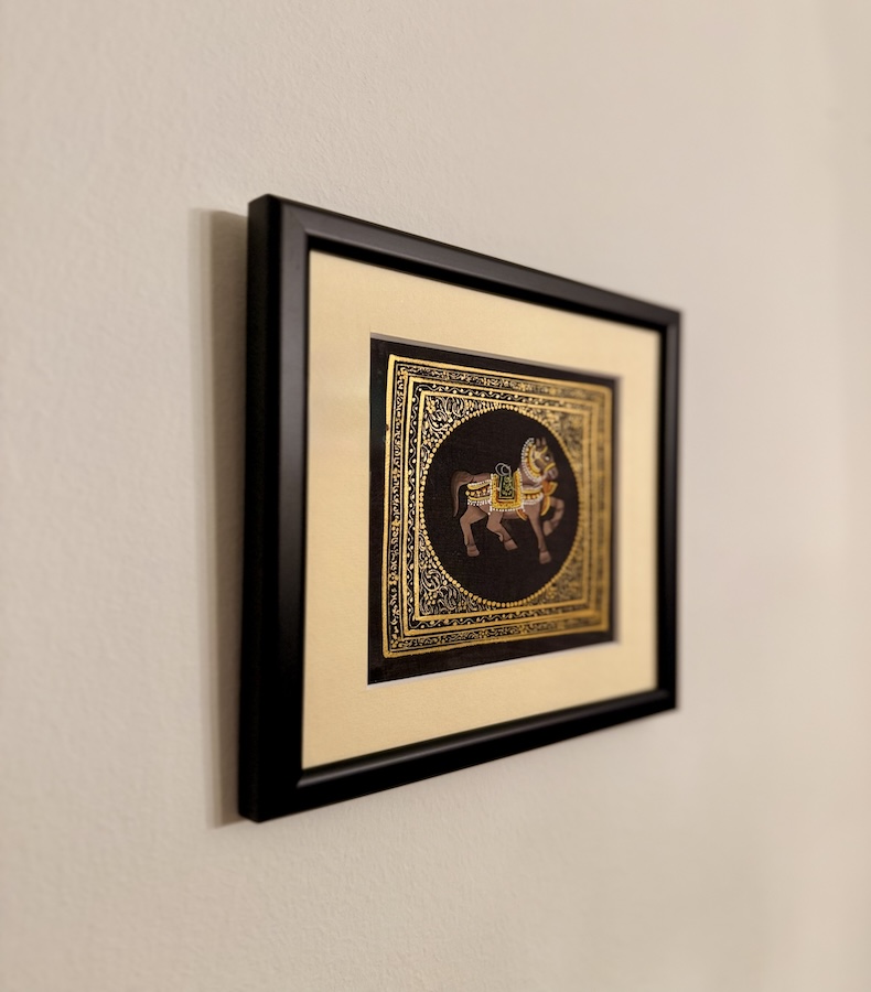 „Royal Stride“ ist ein Meisterwerk traditioneller Rajasthani Miniaturkunst, das den Geist königlicher Eleganz in jedem Pinselstrich einfängt. Das edle Pferd – Symbol für Mut, Würde und Stärke – steht im Zentrum dieser fein gearbeiteten Komposition. Umrahmt von detailreichen goldenen Ornamenten, entfaltet es seine majestätische Präsenz auf tiefschwarzem Seidenhintergrund.