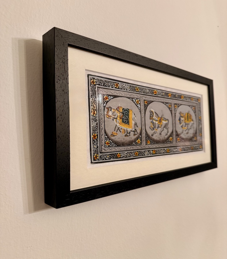 - Herstellung: In liebevoller Handarbeit von Kunsthandwerkern in Indien gefertigt und in Österreich mit höchster Sorgfalt gerahmt.