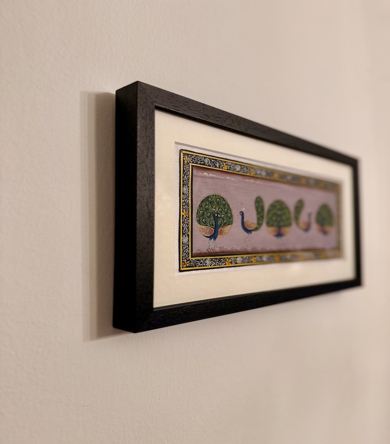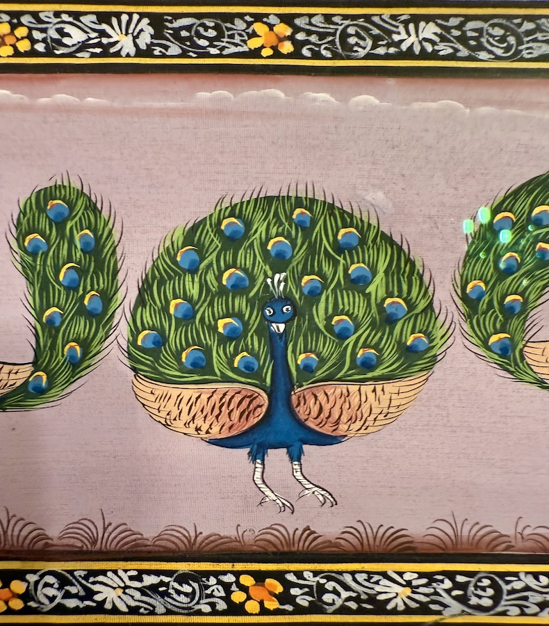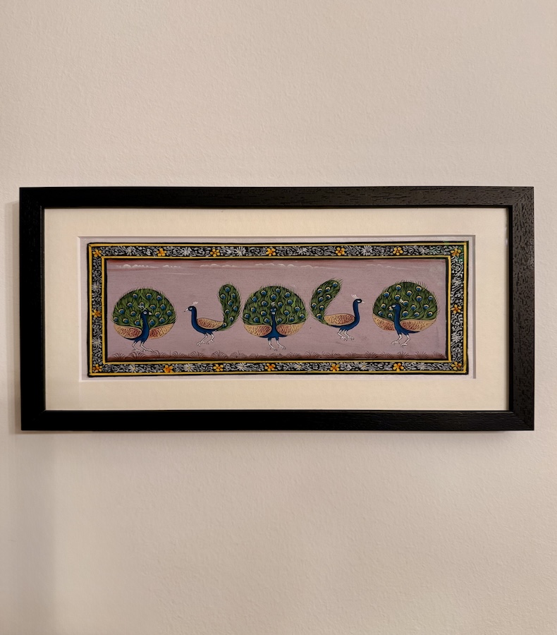 Das Kunstwerk „Whispers of Jaipur“ verkörpert einen Tanz aus Farbe und Anmut. Es zeigt fünf prächtige Pfauen in feinster Handarbeit, Sinnbild für Schönheit, Stolz und Harmonie.