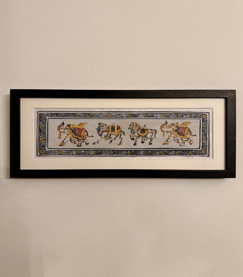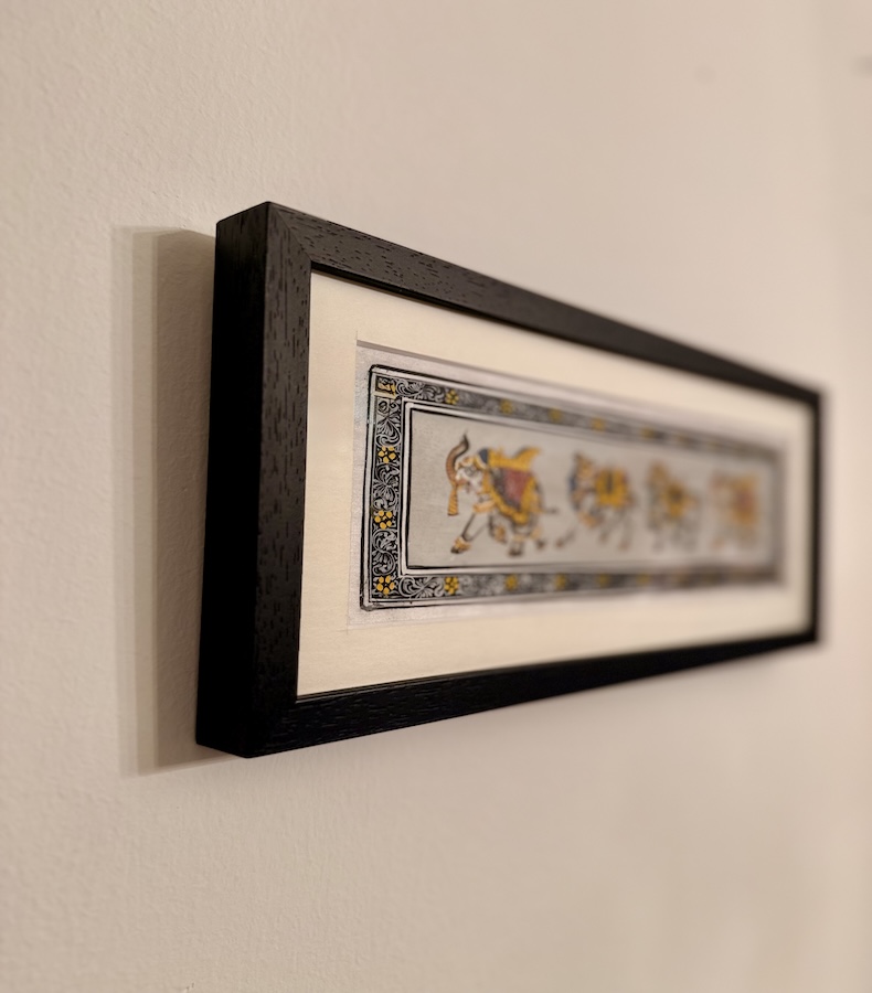 - Herstellung: In liebevoller Handarbeit von Kunsthandwerkern in Indien gefertigt und in Österreich mit höchster Sorgfalt gerahmt.