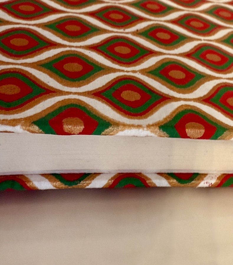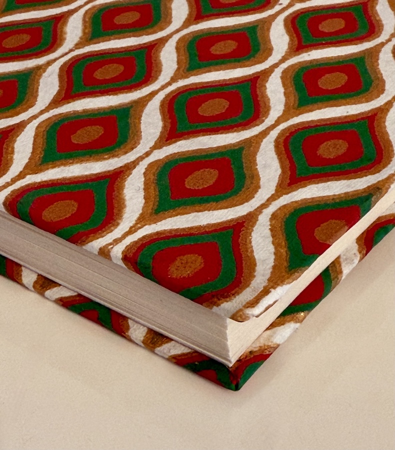Das handgefertigte Notizbuch Amber Rhythm vereint traditionelle Handwerkskunst mit moderner Ästhetik. Aus recycelter Baumwolle gefertigt und mit einem rhythmischen Ornamentmuster in Gold, Rot und Grün veredelt, wird jedes Stück zu einem kleinen Kunstwerk. Ideal für Gedanken, Skizzen oder als stilvolles Tagebuch – nachhaltig, edel und inspiriert von der Farbwelt Rajasthans.