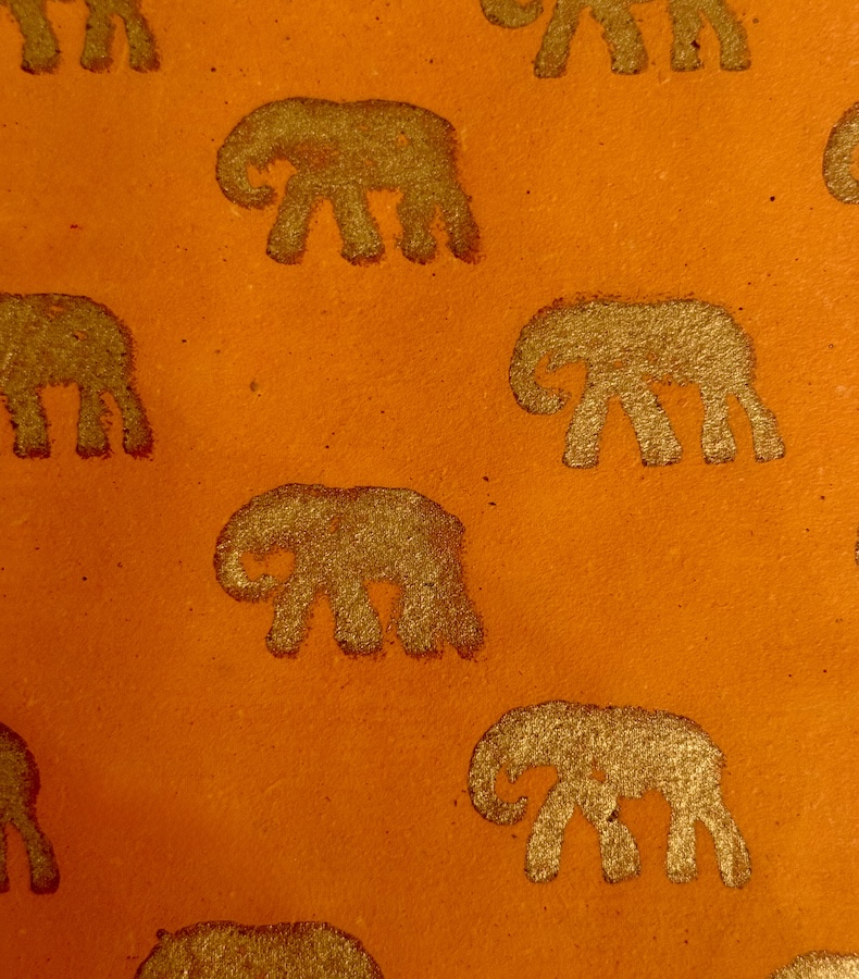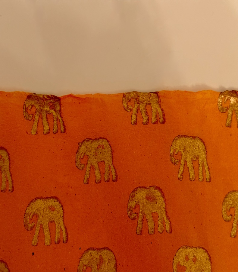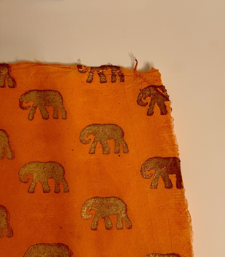 Unser bezauberndes Papier Amber Elephant ist von der indischen Sonne inspiriert – handgeschöpftes Papier in warmem Bernsteinton mit goldenen Elefanten, die an königliche Karawanen durch Rajasthan erinnern.