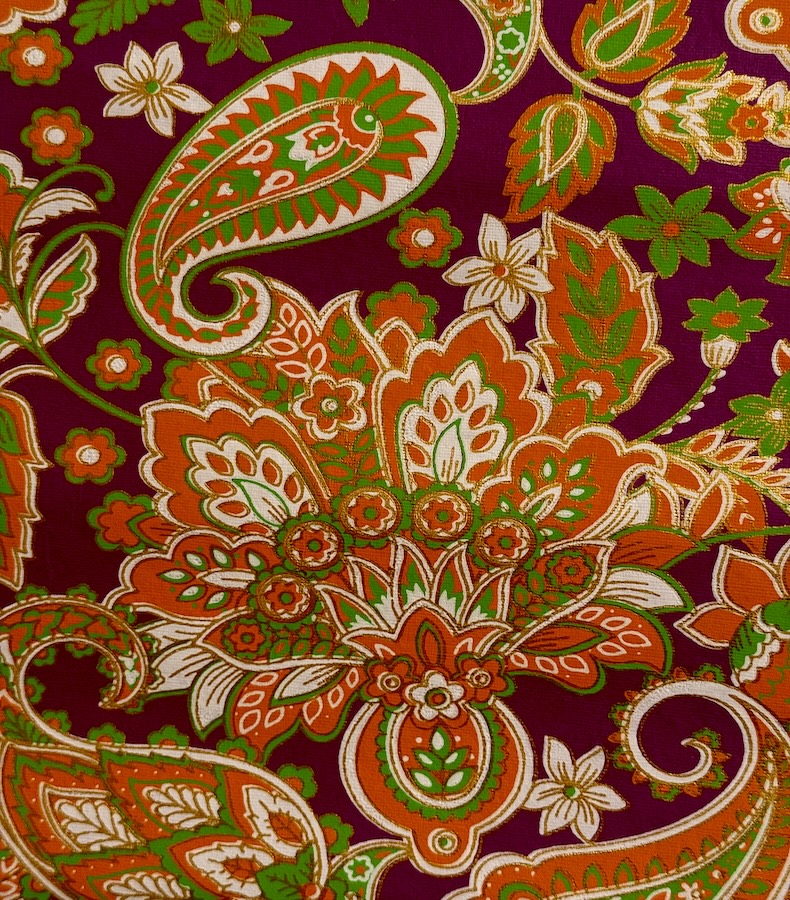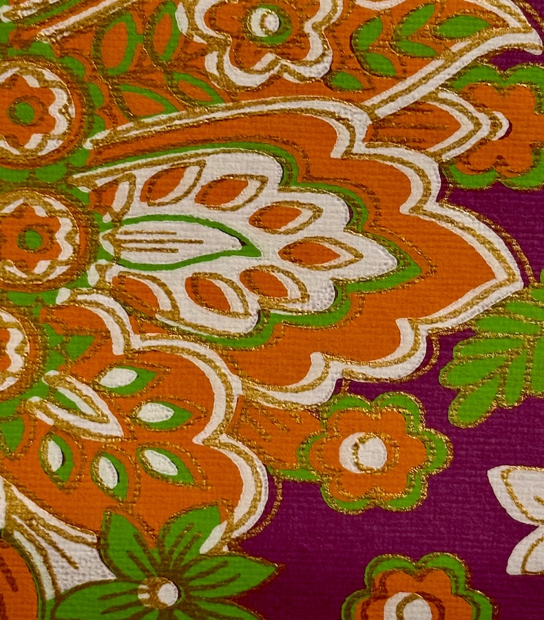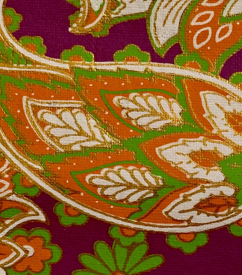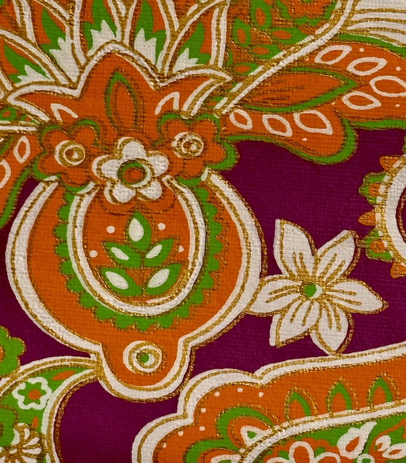 Maharani Garden entführt in die üppigen Palastgärten Rajasthans. Das tiefe Violett bildet den Hintergrund für ein prachtvolles Spiel aus Blüten, Ranken und Paisleys in Grün, Orange und Gold und entfaltet in seiner gesamten Herrlichkeit eine pulsierende Energie.