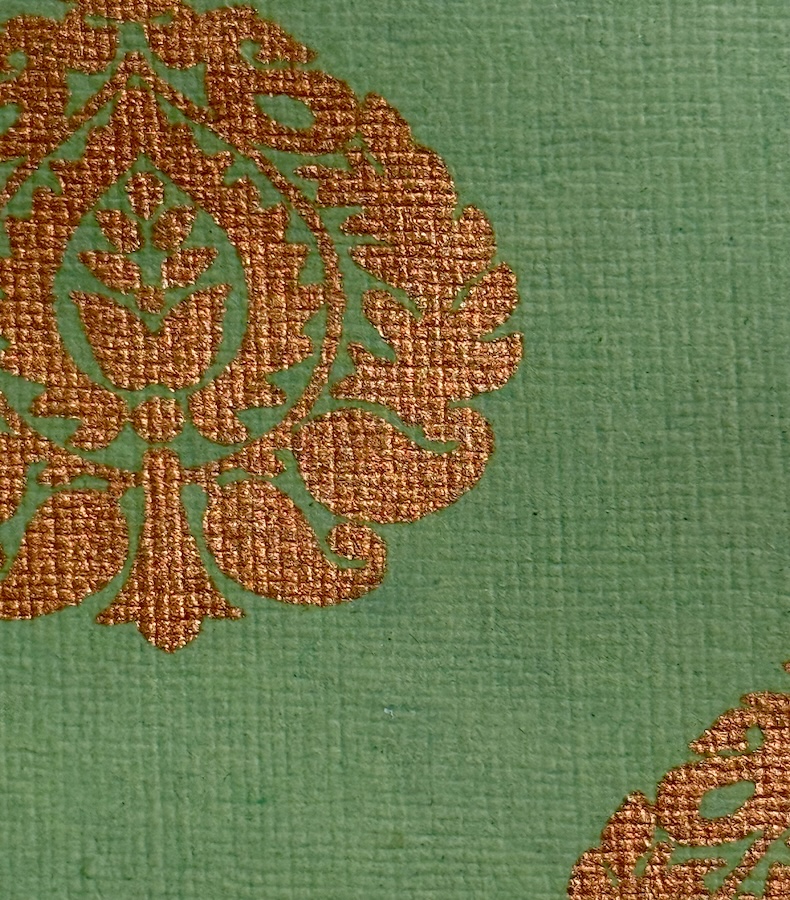 Verdant Grace verkörpert die subtile Schönheit der Natur in vollendeter Harmonie. Das sanfte Salbeigrün erinnert an üppige Gärten Rajasthans, während goldene Blüten zart darüber erblühen – ein Spiel aus Leichtigkeit und Luxus.