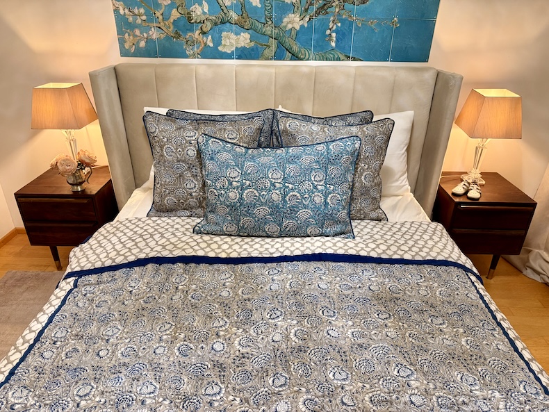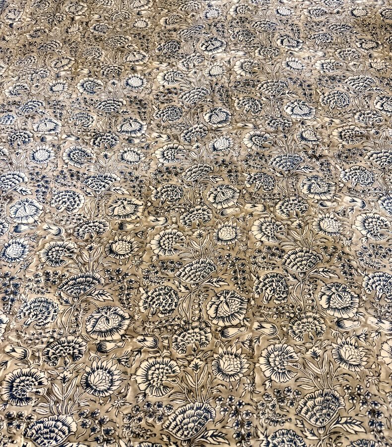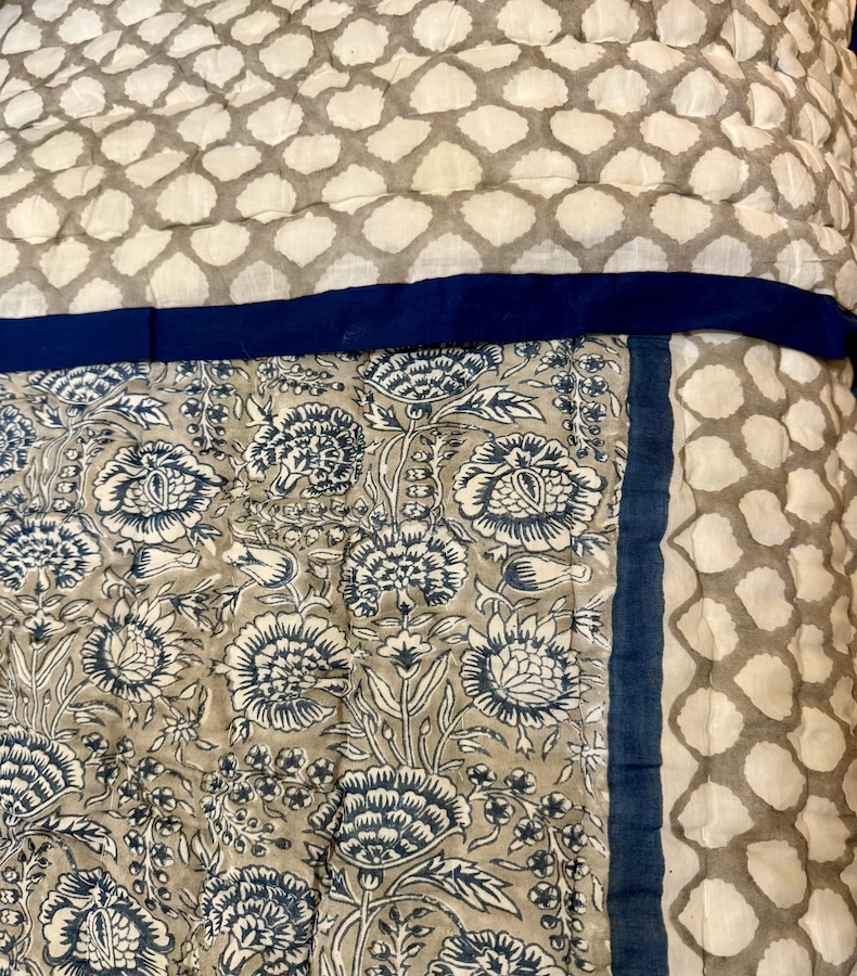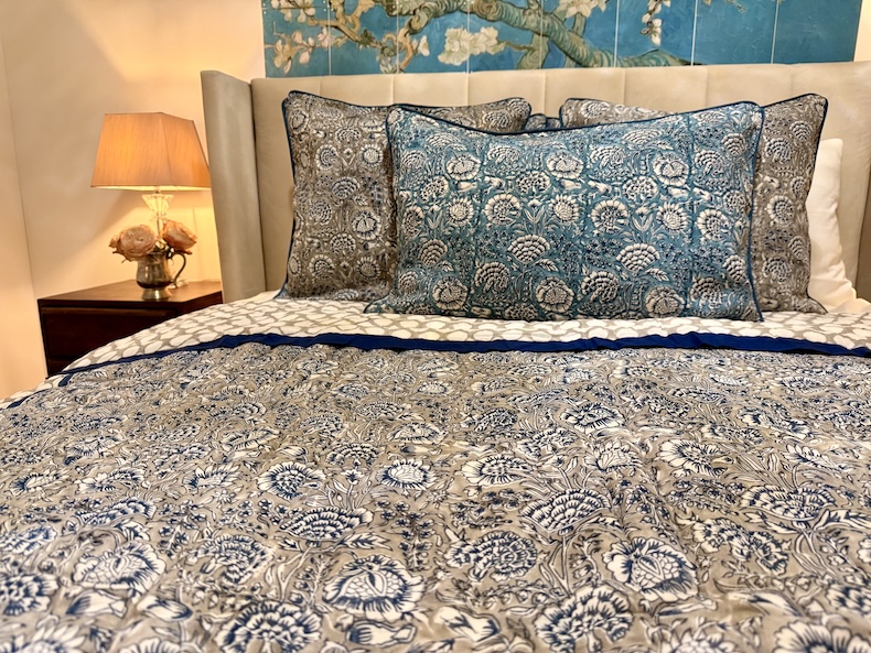 Jedes Detail dieses Quilts wurde in Jaipur von erfahrenen Handwerkskünstlern gefertigt – Schicht für Schicht, Muster für Muster, in traditioneller Blockprint-Technik. Dadurch entsteht eine Textur, die nicht nur optisch berührt, sondern auch die Wärme echter Handarbeit spürbar macht.