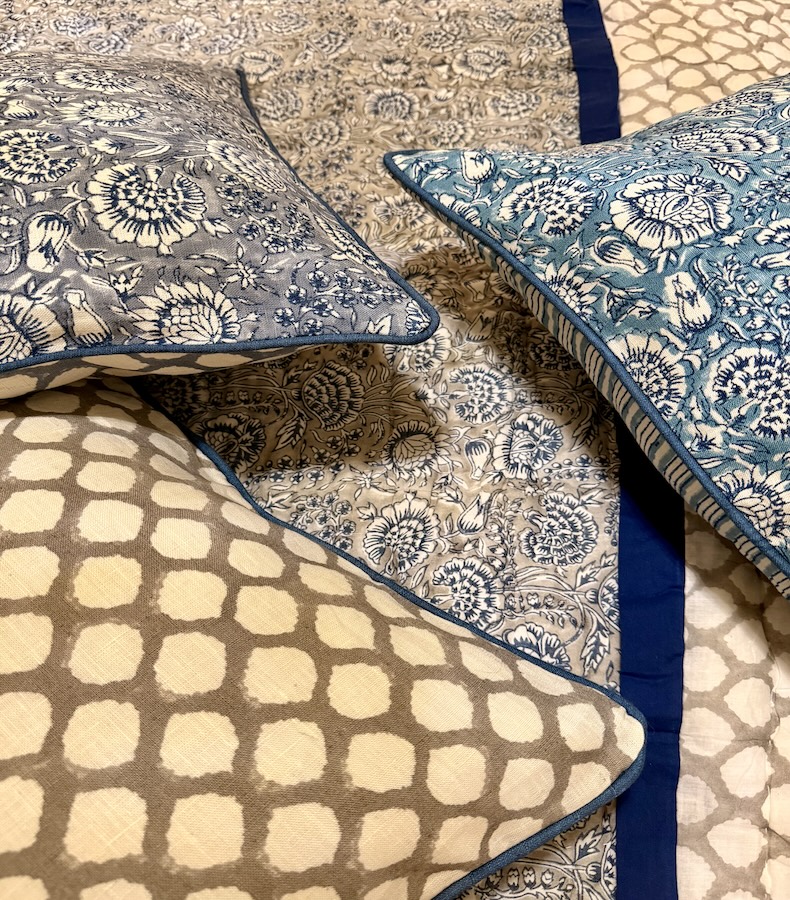 Unser wunderschöne Quilt Indigo Garden Essence bildet das Herzstück der Indigo Garden Reverie Kollektion. Sein zartes Meer aus kühlen, grau-weißen Blüten verleiht ihm eine frische, elegante und zeitlos harmonische Ausstrahlung. Dieser Quilt bringt eine subtile Leichtigkeit in dein Zuhause – eine Hommage an die stille Poesie indischer Gärten, geprägt von feinen Linien, sanften Blütenmotiven und pudrigen Indigotönen, die jedem Raum eine ruhige, luxuriöse Note verleihen.