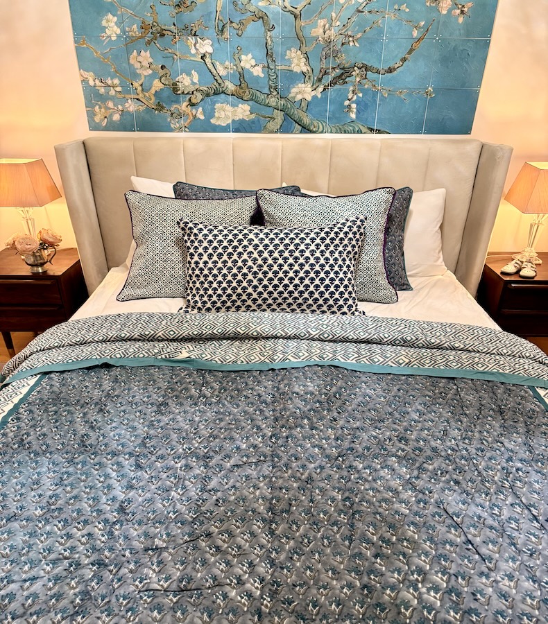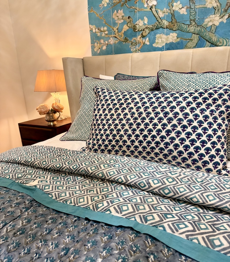 Jedes Detail dieses Quilts wurde in Jaipur von erfahrenen Handwerkskünstlern gefertigt – Schicht für Schicht, Muster für Muster, in traditioneller Blockprint-Technik. Dadurch entsteht eine Textur, die nicht nur optisch berührt, sondern auch die Wärme echter Handarbeit spürbar macht.