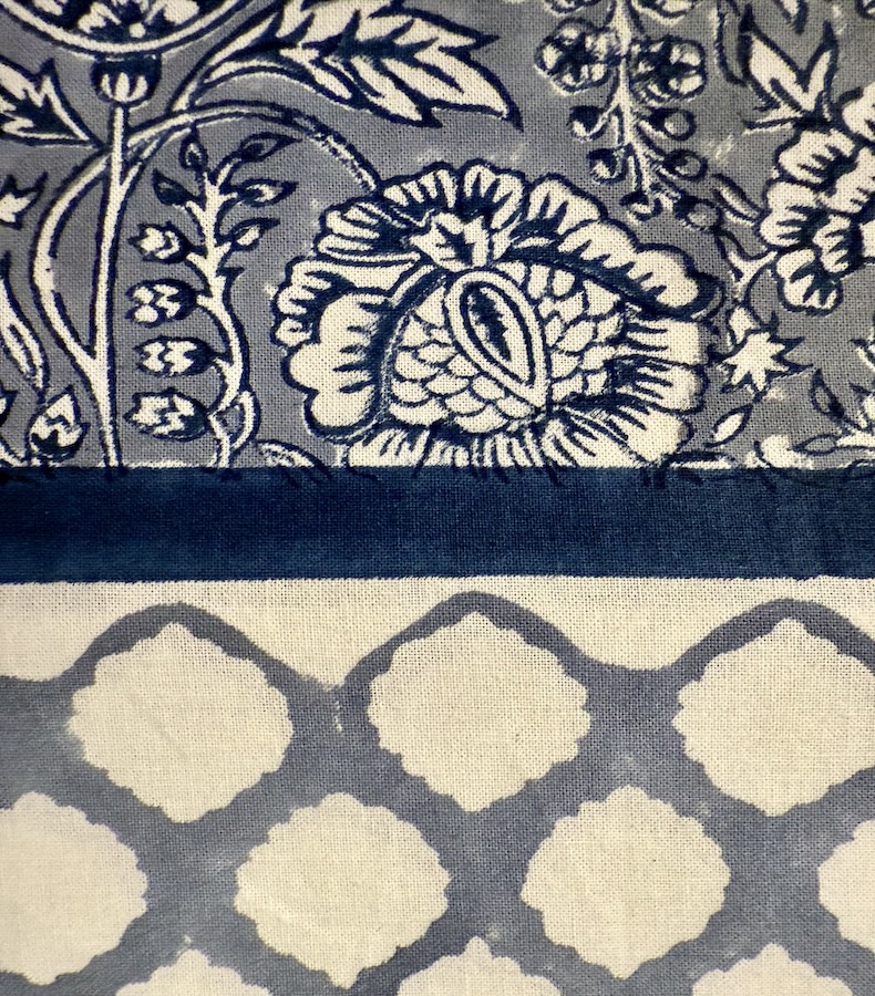 Jedes Stück dieser Kollektion wird im traditionellen Handblock Printing gefertigt – einem jahrhundertealten Kunsthandwerk aus Indien. Feine Blütenmotive, präzise Linien und tiefes Indigo ergeben ein harmonisches Gesamtbild, das sowohl Ruhe als auch Raffinesse ausstrahlt.