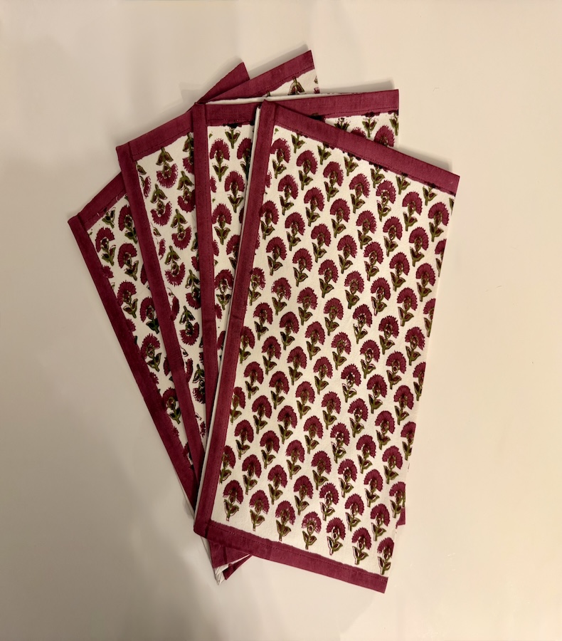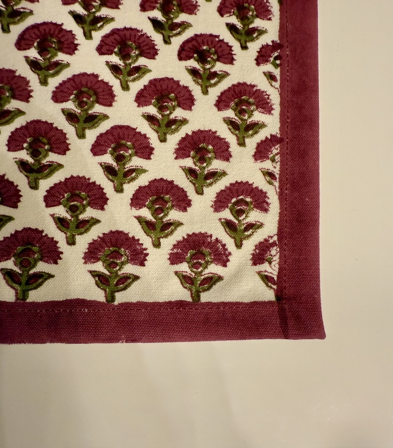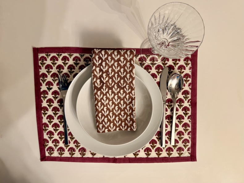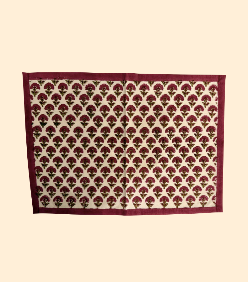 Unser Tischset aus der Mocca Mousse Dream Collection I wird in Rajasthan traditionell von Hand bedruckt und veredelt jedes Tischarrangement mit warmen, sanften Naturtönen. Das florale Muster, eingefasst von einem beerigen Rand, schafft einen ruhigen, edlen Rahmen für jedes Gedeck – perfekt für Einladungen, besondere Anlässe oder als stilvolles Alltagsdetail.