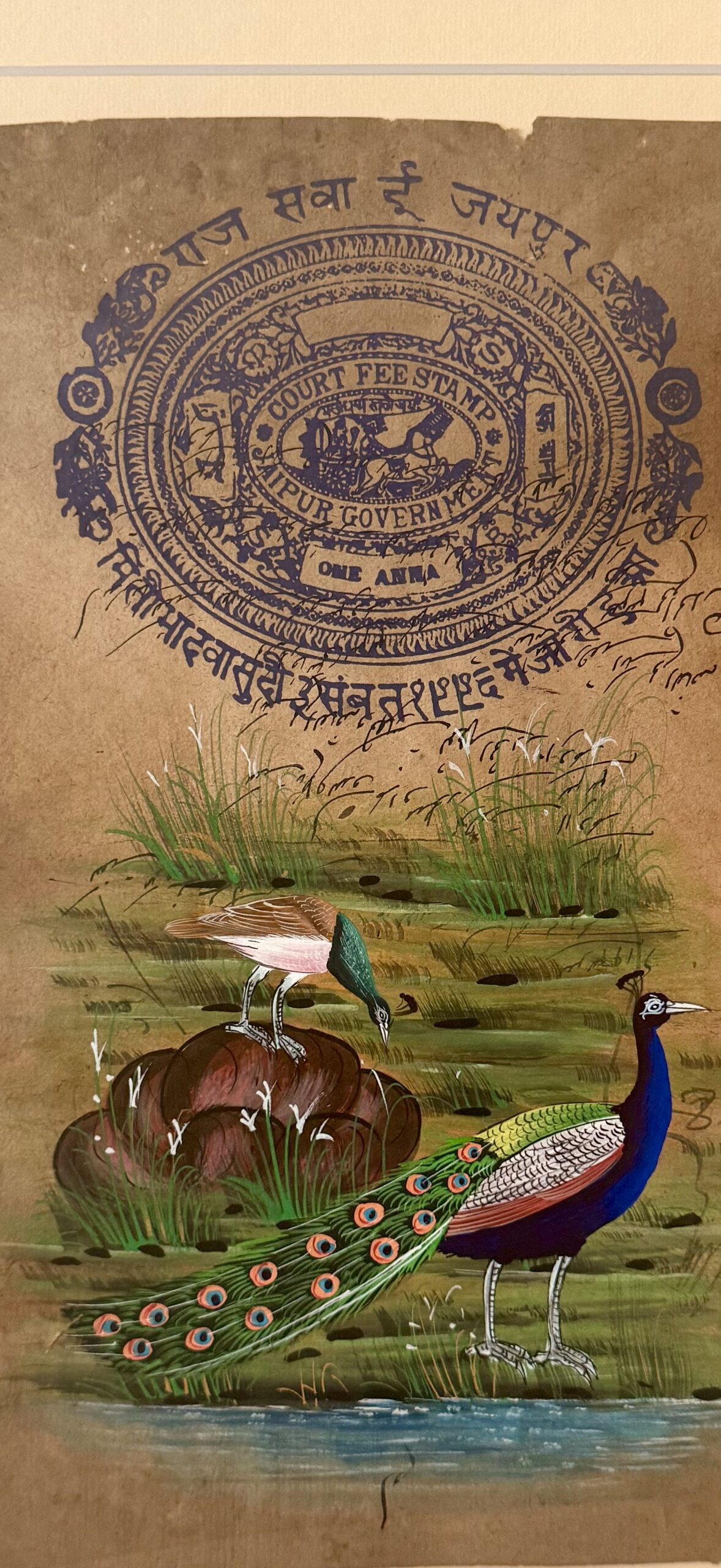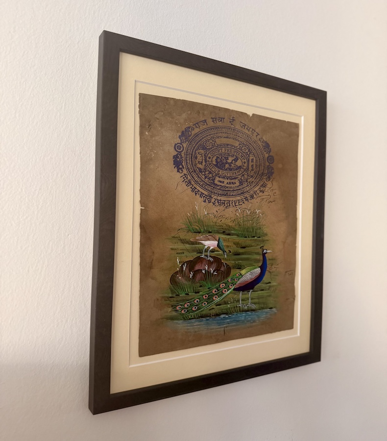 Dieses außergewöhnliche Kunstwerk verbindet traditionelle indo-persische Ästhetik mit der symbolischen Schönheit des Pfaus – dem Nationalvogel Indiens. Auf gealtertem Stempelpapier gemalt, das von feiner Urdu-Kalligrafie durchzogen ist, entsteht eine faszinierende Komposition aus Geschichte, Kunst und Kultur.